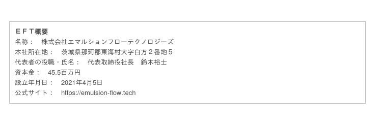 株式会社エマルションフローテクノロジーズ(本社:茨城県那珂郡東海村、代表取締役社長:鈴木裕士、以下「EFT」)は、新規溶媒抽出技術「エマルションフロー」によるレアアース(希土類元素)の高効率、高純度精製の実証に係る共同研究契約を独立行政法人石油天然ガス・金属鉱物資源機構(本部:東京都港区、理事長:細野哲弘、以下「JOGMEC」)と締結しました。