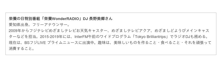 〇プレゼント企画など情報は、InterFM「栄養WonderRADIO」のページよりご確認ください。
