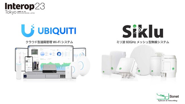 "ソネット株式会社(本社:神奈川県鎌倉市腰越4-3-4、代表取締役:小林博昭)は、Wi-Fiネットワーク、有線ネットワーク、カメラネットワークが統合されたクラウド型無線システムUbiquiti UniFi「ユビキティ ユニファイ」とミリ波で世界的なシェアを獲得しているSikluのメッシュ型長距離無線を2023年6月14日(水)~16日(金)に幕張メッセで開催されるInterop Tokyo 2023に出展致します。