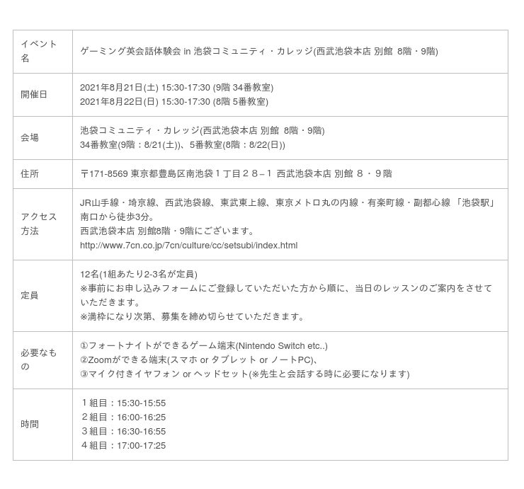 ゲーミング英会話を運営するeスポーツ商社「REEV株式会社」(本社:東京都中央区、 代表取締役:渡部裕介)は、セブン&アイ・ホールディングス傘下の株式会社セブンカルチャーネットワーク(本社:東京都千代田区、 代表取締役:萩原秀之)と業務提携し、2021年8月21日(土)・22日(日)に池袋コミュニティ・カレッジ(西武池袋本店 別館 8階・9階)にてフォートナイトで英語学習ができる「ゲーミング英会話」体験会を開催致します。
