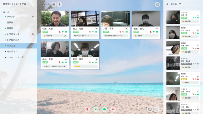 LIVEWORKでは、これまでも組織・チーム・プロジェクト・ロケーションなど、自由な目的で仮想のルームを作成し、ルームメンバーの音声・写真・ビデオ・画面共有・ファイル・ステータスなどが常時接続でリアルタイムに共有が可能でした。