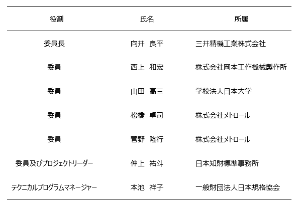 今般のNEDOプロでは、2022年度に株式会社メトロール及び弊所がJSA規格での開発を応募し、開発主体を担う規格開発グループで規格化までを行いました。公益社団法人 砥粒加工学会の会長も務めた向井良平氏には委員長に就いていただきました。株式会社メトロールからは、NEDOプロの開発責任者である菅野隆行氏、株式会社メトロールの共同開発者でもありセンサメーカからすると顧客でもある株式会社岡本工作機械製作所から西上和宏氏、研削加工に関するアカデミアとして山田高三氏、当該システムのユーザとして株式会社メトロールから松橋卓司氏が委員に就き、規格の執筆及び規格開発の責任者としての役職であるプロジェクトリーダーを弊所の仲上祐斗が務め、JSA規格のスキームオーナーとしてテクニカルプログラムマネージャーを一般財団法人日本規格協会の本池祥子氏に務めていただきました。