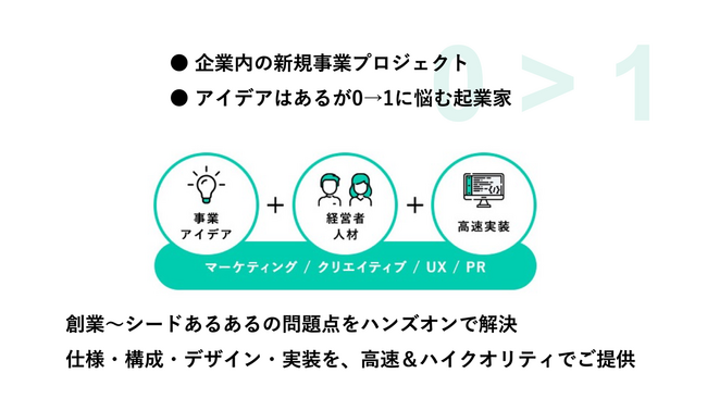 「アイデアはあるが実装方法に悩む経営者」や「社内で新規事業プロジェクトは立ち上がったが進め方に悩んでいる企業」などの課題に応えます。「事業アイデア+経営者+高速な実装」で、まず0→1の事業は生まれます。これを連続して生み出すための体制を用意しています。