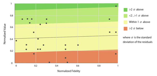 実施されたプロトタイピングそれぞれについて、どの程度の時間がかかったかを示す「所要時間」と、どの程度そのプロトタイピングを実施することで価値がある情報が得られたかを示す「得られたデザイン情報」という2つの指標を用いて回帰分析を行い、経済性が高いプロトタイピングと経済性が低いプロトタイピングを示しました。