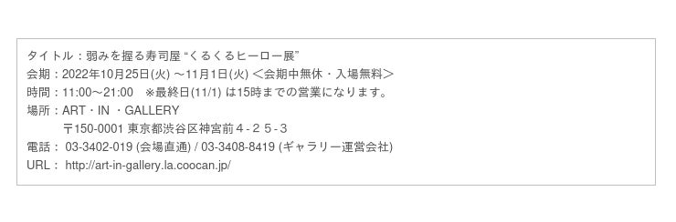 アートディレクター集団「弱みを握る寿司屋」は、10月25日(火) ~11月1日(火)の8日間にわたり「ヒーロー」にまつわるデザイン展を原宿・表参道にあるアート・イン・ギャラリーにて開催いたします。