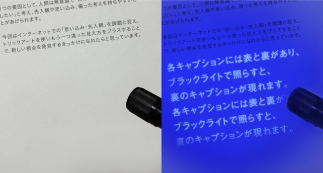 各キャプションには表と裏があり、ブラックライトで照らすと、裏のキャプションが現れます。
