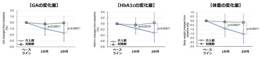 参加者98名(男性72.0%、年齢63.2±11.4歳、HbA1c 7.39±0.39%)を介入群と対照群に無作為に割り付けました。介入群では、ベースラインから最終観察日までのGA値およびHbA1c値の有意な低下が観察されました(それぞれ-1.71±1.37%、-0.32±0.32%)。また、体重、ウエスト周囲長、カロリー消費量の有意な減少(それぞれp<0.0001、p=0.0003、p=0.0346)も観察されましたが、カロリー摂取量の有意な減少は観察されませんでした(p=0.678)。