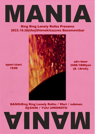 昨年、ワンマンライブを成功させた思い出の地でもある下北沢BASEMENT BARにて新作タイトルを冠したリリースパーティー「MANIA」の共演には、マリ、submen、SHiN、YUU UMEMOTOが決まっている。
