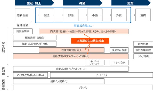 本実証実験では、顧客情報を含むID-POSデータを用いた需要予測を行うことによって、小売業・卸売業の発注精度がどの程度向上するのかを検証します。加えて、需要予測データを製造業と連携させることで、過剰生産を抑止するための生産計画の可能性についての検証も行います。