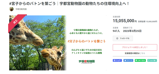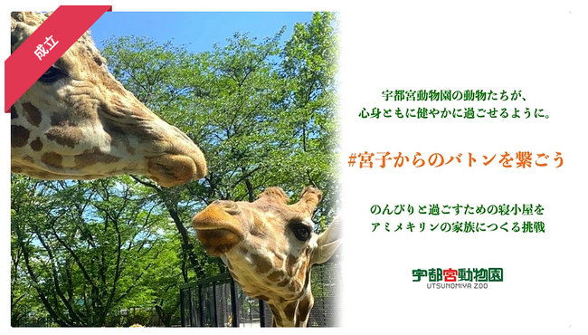 宇都宮動物園(所在地:栃木県/代表:荒井賢治)は、2023年2月13日から同年3月25日まで、クラウドファンディングサービス「READYFOR」にて、キリン舎に寝小屋を新設するために「#宮子からのバトンを繋ごう|宇都宮動物園の動物たちの住環境向上へ!」を公開し、1,500万円を目標に、支援を募りました。