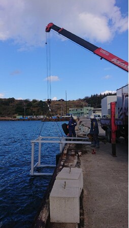 ステップ1. 先ずは、「往復型回転加速式波力発電」を岸壁に設置するための「固定フレーム」を取り付けます。 ユニック車で吊り上げて、慎重に位置決めを行いアンカーボルトで取り付けました。