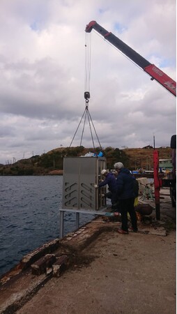 最新型の「往復型回転加速式波力発電」を使用した実証となります。実証場所は、事前に調査した複数の(適地)候補地の内から島内の海士港という港の岸壁を使用して行うことにいたしました。設置は、次の3ステップです。