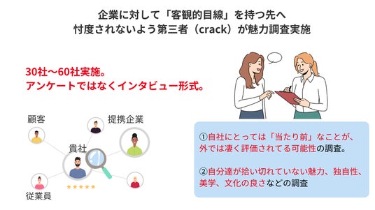 その企業にしかない素晴らしさや自社では気付けていない社会的価値を可視化するために、当社が徹底的に調査を行います。社員だけでなく、顧客・提携企業にも協力を依頼し、多様な視点から企業の魅力を深掘りしていきます。