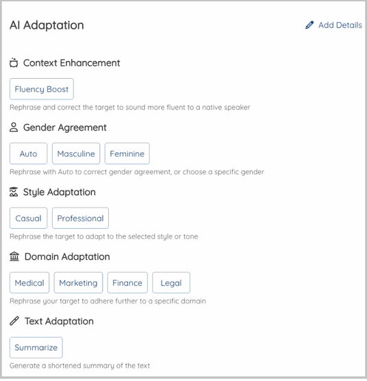 現在、生成AIによる補完・調整に対応するターゲット言語は、英語・フランス語・ドイツ語・イタリア語・スペイン語の5言語です。さらに、2026年7月には日本語を含む20言語の追加アップデートを予定しています。