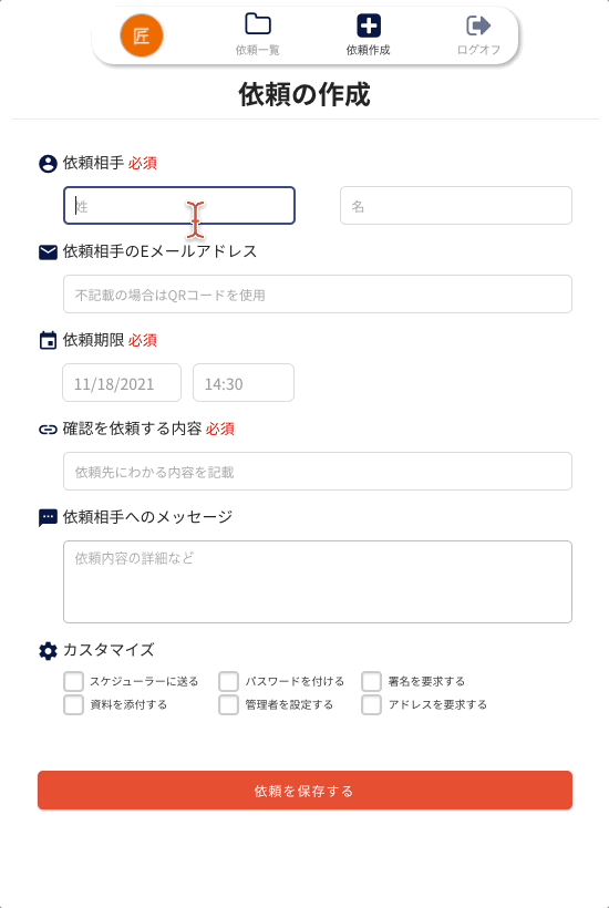 依頼作成には名前(姓のみ)、依頼期限、依頼の内容の3つの情報を入力するだけ