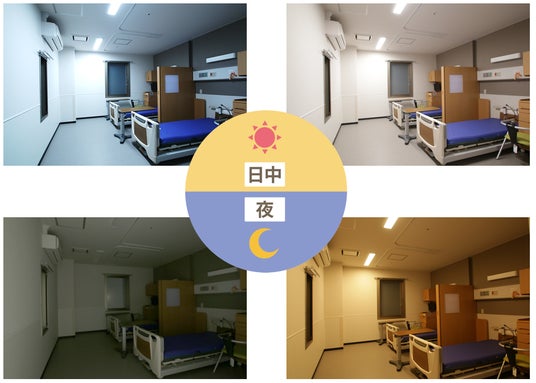 朝の灯り、昼の灯り、夕方の灯り、夜の灯りの4シーンの照明を自動で再生。病室のカーテンが開いていなくても、一日の流れを照明で再現します。