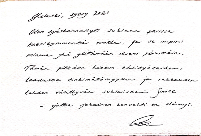 以来20年以上彼女はチョコレート作りに携わり、芸術と愛、技術のこもったチョコレートを生み出す彼女の工房はフィンランドでも知る人ぞ知る人気のお店となっている。