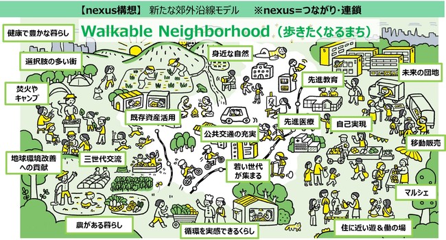 本構想では、東急沿線郊外の多摩田園都市をnexus構想エリア(注1)と位置づけ、住む・学ぶ・働く・遊ぶといった生活が自然や農と融合する、「歩きたくなるまち」への進化を目指し、東急と当グループがその座組みづくりと具体的な施策を以下のように進めます。