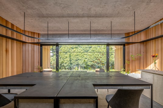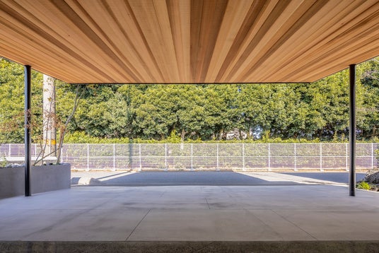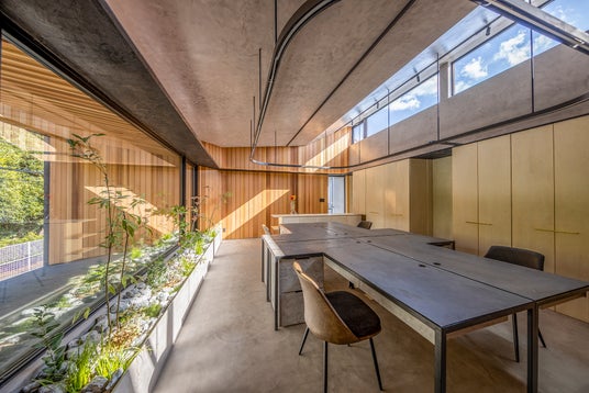 2階オフィスは北側の緑地帯に向けて約3.6mのオーバーハングを設け、豊かな緑と一体化する空間としました。この大きな庇は、1階倉庫での左官資材の搬入時に雨を防ぐ実用的機能を持ちながら、漆喰塗り体験やワークショップを開催できる「外と中のあいまいな空間」としても機能します。