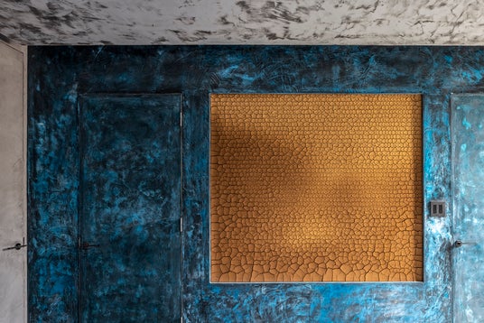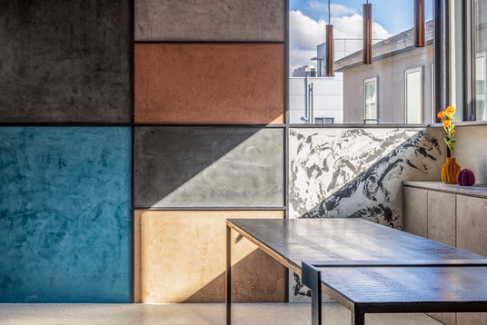 仕上げにはモールテックスを採用し、面ごとに凹凸のある台形下地をつくることで、左官ならではの高度な技術力と独自のリズム感を表現しています。