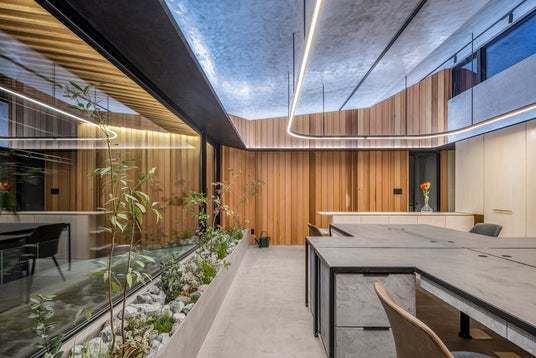 外と内の中間領域に緑の空間を設けることで、建物奥の借景との一体感を高めています。