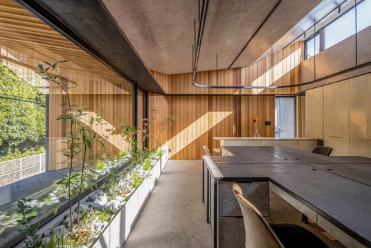 北側の借景と南側の高窓から光と緑を取り込み、室内奥の花壇にも自然光が届く設計としました。