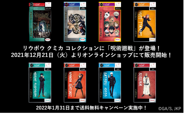 沖縄県の経済活性化を目指す株式会社リウボウ商事(本社:沖縄県那覇市牧志、代表取締役 糸数剛一)は人気TVアニメ「呪術廻戦」と「クミカ」のコラボレーションを決定いたしました。2021年12月21日(火)より全8種類の商品をオンラインショップにて販売します。URL:https://kumica.base.shop/categories/3975302