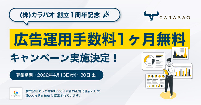 企業のマーケティング支援を行う株式会社カラバオ(所在地:広島県尾道市 代表取締役:村上侑司)は創立1周年を記念して広告運用手数料1ヶ月無料キャンペーンを実施します。