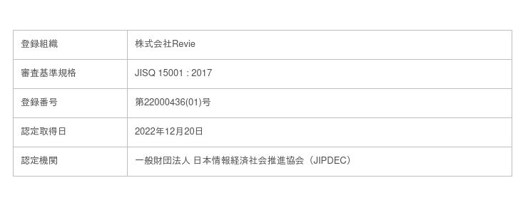 株式会社Revie (東京都港区、代表取締役:中沢弘樹、以下「Revie」)は、一般財団法人日本情報経済社会推進協会(JIPDEC)より「プライバシーマーク」の認定を受けたことをお知らせいたします。