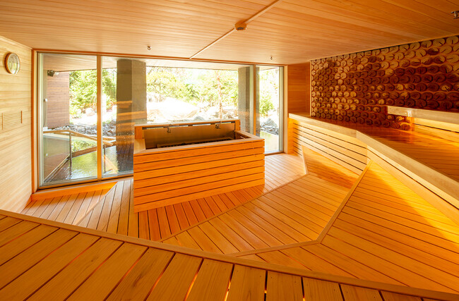 熱したサウナストーンに水をかけて水蒸気を発生させる「セルフロウリュ」により低温でも発汗が促進されるフィンランド式のサウナは、コントロールパネルで90℃まで温度調節が可能です。ライティングの色が変更でき、Bluetooth接続によりサウナ室内で音楽を聴くことができるなどのつくりは、2021年にオープンした「定山渓万世閣ホテルミリオーネ」の展望サウナと同仕様となっています。サウナ室からの「ととのう」動線を意識したテラスには、2人同時に入れるほどゆとりある洞爺湖水かけ流しの水風呂と、くつろげるリクライニングチェアを設置。洞爺湖や浮かぶ中島、羊蹄山を望む外気浴で「究極のととのい」をご体感いただけます。