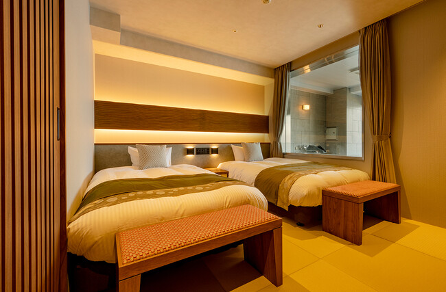 リニューアルした特別室は温泉展望風呂付客室4室。うち1室は展望サウナ「saunoa room」とコネクティングすることで、プライベート空間で温泉とサウナの両方を楽しめる贅沢な空間となっています。