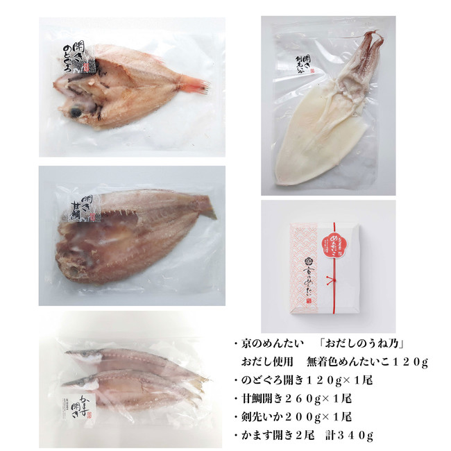 「のどぐろ」の他に「京のめんたい」を乗せたご飯やお酒にあう「甘鯛」「剣先いか」「かます」の干物のセットしたお買い得なセットです。