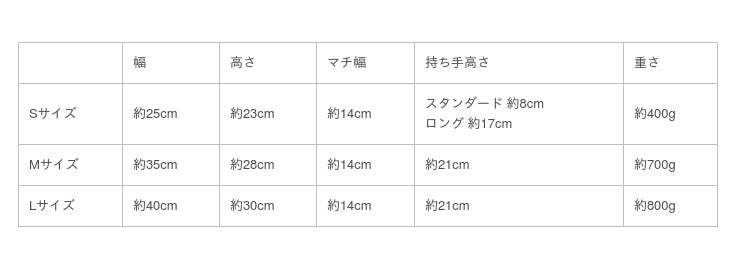 サイズはS、M、Lを用意。ちょっとしたお出かけに必要なものを入れられるSサイズ、買い物やお仕事で荷物が多い時にも便利なMサイズ、Lサイズを用意しました。