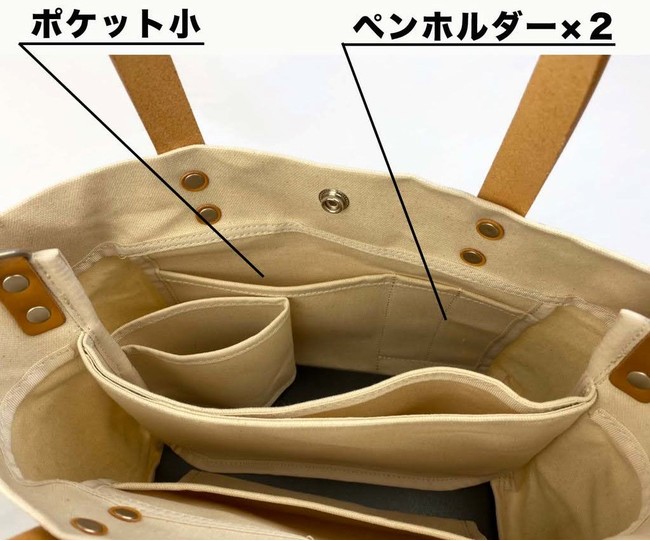 当社のトートバッグ「abb(アベベ)」でも好評のバッグ内ペットボトルホルダーの他、ペンホルダー、小物入れポケットも複数用意