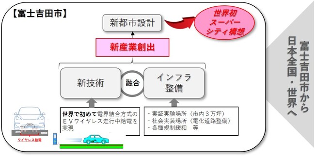 富士ウェーブが保有する「電界結合方式のEVワイヤレス走行中給電技術」と富士吉田市による「社会実装に向けたインフラ整備」を融合し、脱炭素社会に向けた新産業を創出・発展させて地域活性化を図ると共に、この富士吉田市発の産業を日本全国・世界へ展開していきます。