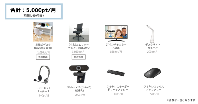 パソコンデスクやチェア、モニター、ウェブカメラといったリモートワークに必須の備品類から、在宅勤務における心身の健康をサポートするフィットネス機器やリフレッシュ家電に至るまで、計1,000点超のアイテムから、各企業が設定したポイント数(=社員一人あたり月額予算)に応じて各社員が最適なものを自律的に選択できます。状況にあわせて返却・追加・交換を行うことで(レンタル形式)、常に最適なリモートワーク環境を構築することができます。