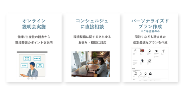 また希望者には専任のコンジェルジュがつき、一人ひとりに合わせた面談も実施。リモートワーク環境整備に特化した専門家に自身の間取りや環境を踏まえ、具体的な相談をすることができます。