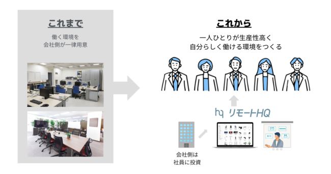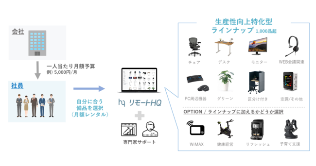「リモートHQ」は、リモートワークを導入する企業が、社員一人ひとりにとって最適なリモートワーク環境の整備をアウトソースできる、これまでにない福利厚生ソリューションです。