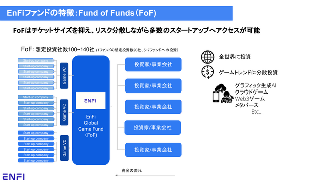 この度設立した2号ファンドのEnFiグローバルゲームファンドは、ファンドに投資をするファンドであるFund of Funds (FoF)の投資形態を採用し、1号ファンドよりも投資ファンド数を増やし、世界各地の異なるゲーム特化型VCファンドに投資を行います。