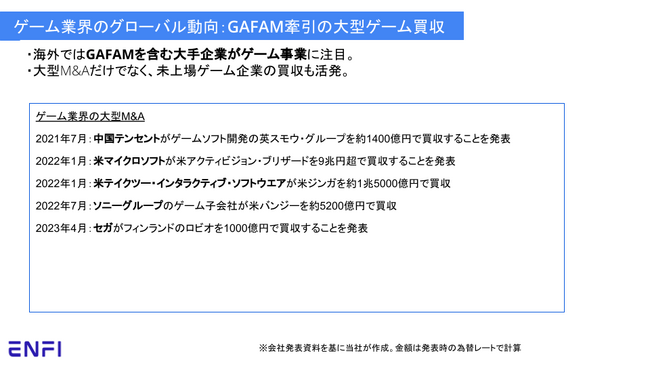 この流れは2021年のEnFi1号ファンド設立以降も顕著で、海外ではGAFAMを含む大手企業による数千億~数兆円のゲーム企業M&Aが立て続けに起きていることからも、ゲーム事業が世界的に注目されていることがわかります。