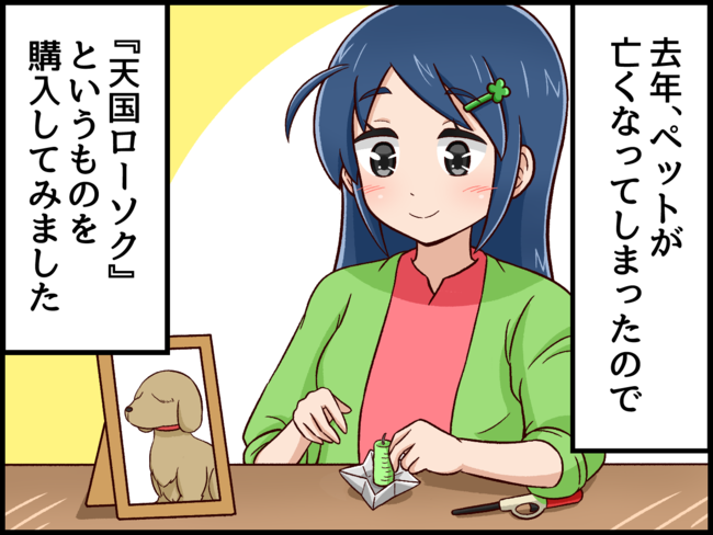 「天国ローソク」は死別された方の心を癒やすグリーフケアグッズとして制作されたロウソクです。ペットロスの癒しになるミニサイズの本品は、可愛い星型のロウ受け付きなので、ロウソク立てがなくてもテーブルで灯せます。天国に想いを届けるとともに大切な思い出が蘇る様を4コマイラストで表現しています。
