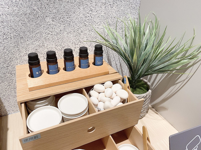 気分転換のツールとして、全部で5種のアロマオイルブレンドをご用意。「集中」、「リラックス」など、その日の気分でお選びいただき、素焼きのストーンにオイルを垂らすだけで、ゆっくりを香りをお楽しみいただけます。