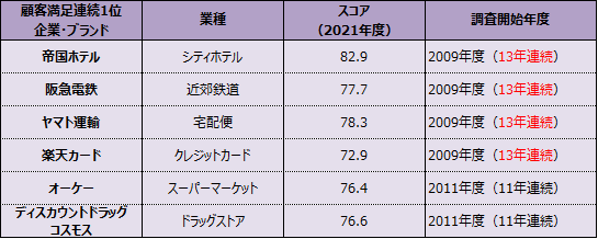・13年連続業種1位は帝国ホテル・阪急電鉄・ヤマト運輸・楽天カード