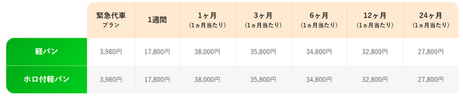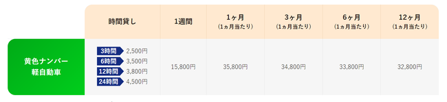黄色ナンバー(軽自動車)では時間貸しを行っており、3・6・12・24時間の中からお選びいただけます。料金は2,500~4,500円です。1ヶ月あたり35,800円、24ヶ月では1ヶ月あたり32,800円でご利用いただけます。