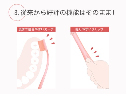 従来の歯ブラシで「持ちやすい」と好評の極太グリップはそのまま踏襲しました。ヘッド部の大きさに関わらず、「しっかり持てる=磨きやすい」という方程式は不変です。