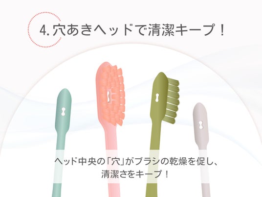 穴あき歯ブラシの最大の特長であるブラシ部の真ん中に開いた穴。合わせて、ブラシ毛と柄が統一されたピンク、ライトグレー、グリーン、ライトブルーの4色。これら全てが坂部ブラシの歯ブラシのアイデンティティとなっています。