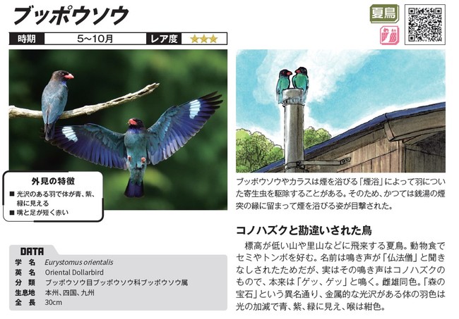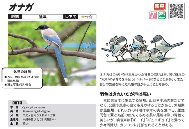 公園などでも観察できるオナガは、つがいを作れなかった独身の若い雄が、同じ群れのつがいの子育てを手伝う「ヘルパー」になることが多く、さらに自分の繁殖を終えた既婚の雄が手伝うこともあります。また、里山などに飛来するブッポウソウは、煙を浴びる「煙浴」によって羽についた寄生虫を駆除するため、かつては銭湯の煙突の縁に留まって煙を浴びる姿が目撃されていました。このようなどこか人間味あふれる愉快な鳥の習性を楽しいイラストで紹介しています。