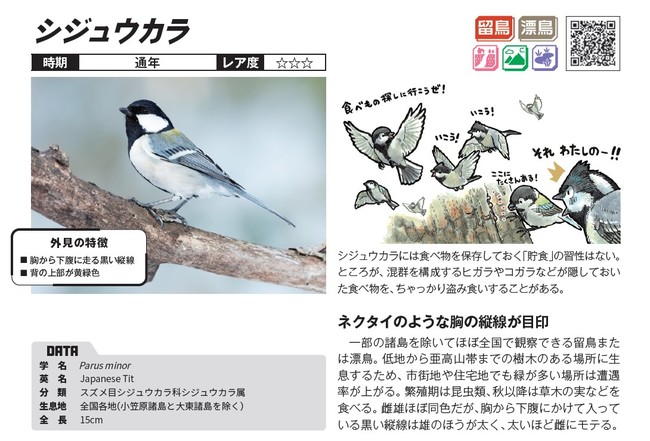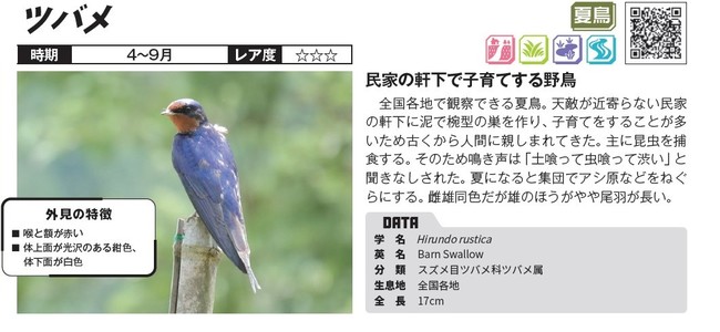 「鳴き声はよく聞くけれど、鳥の名前がわからない」「公園で頻繁に見かけるあの鳥の鳴き声はどんなだっけ?」という初心者バードウォッチャーの“あるある”に応えるべく、本誌に収録した182種すべての鳥の鳴き声が聴けるQRコードを掲載しました。橙色のかわいらしいコマドリは、馬のいななきのような声で鳴いたり、「キリリ、コロロ」と可憐になくカワラヒワは、集団でさえずりを競い、競り勝った雄から雌とつがいになれるという習性を持つなど、鳴き声にまつわるエピソードも楽しめます。