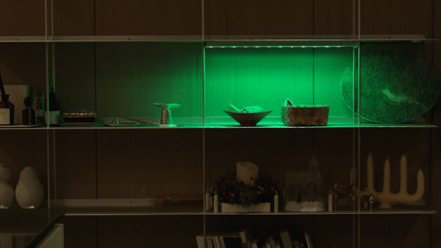 緑色LEDの光は、ムーディーなルームライトにも。人感センサー搭載で近づくと白色灯に早変わり