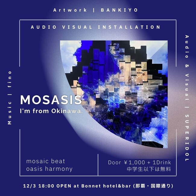 株式会社SUPERPHANTOM、BANKIYO、finoは、「MOSASIS "I'm from Okinawa."」を2022年12月3日 (土)に「Bonnet hotel&bar」(沖縄県那覇市) にて開催します。このイベントは、立体造形、音響、映像の沖縄を拠点とする3名のアーティスト・クリエイターによる、オーディオ・ビジュアル・インスタレーションの展示、及びライブインスタレーションとして実施するものです。